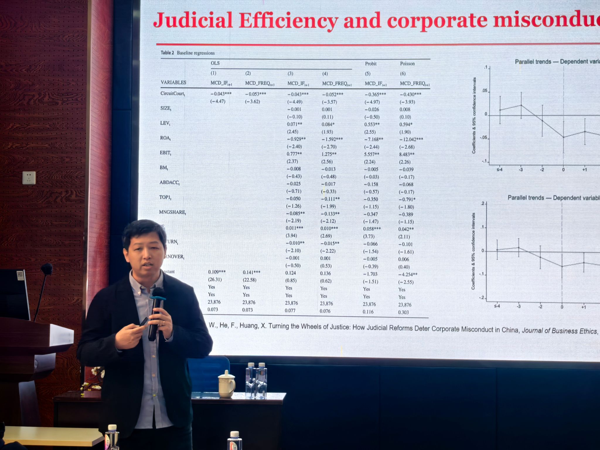 何教授的研究从我国智慧法院建设项目的视角考察了司法效率对企业可持续发展战略的影响。首先,何教授介绍了对ESG(环境、社会和治理)的相关历史研究,并对智慧法院建设项目展开具体介绍。最后对实证结果展开介绍。何教授的研究表明,智慧法院的建设提升了企业ESG表现。第一,智慧法院的建设能够提升案件裁决的质量和效率,增加企业诉讼风险及实际诉讼压力,从而提升企业的ESG表现;第二,智慧法院建设对企业ESG绩效的影响在不同地区、企业和员工之间表现出异质性。