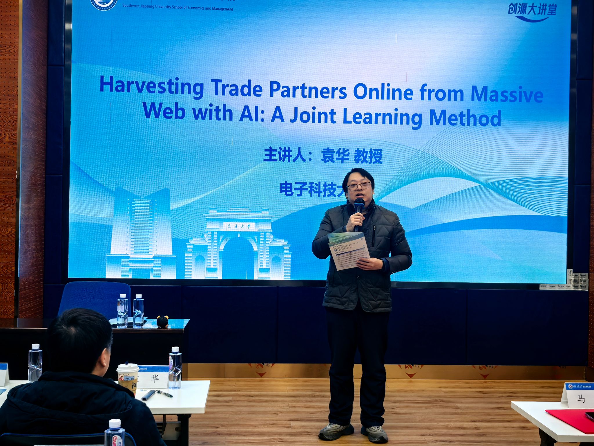 信息系统与运营管理系刘盾教授主持。他在对报告嘉宾的研究领域与学术成就进行简要介绍后,电子科技大学袁华教授受邀登台,作题为Harvesting Trade Partners Online from Massive Web with AI: A Joint Learning Method的精彩报告。报告直击中小企业(SMEs)在线搜寻商业伙伴时的管理困境,在通过搜索引擎在线寻找潜在商业伙伴时,面临的数据分散、交互繁琐、检索效率低下等现实难题。
