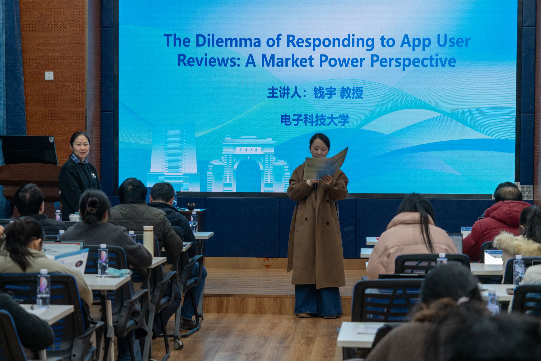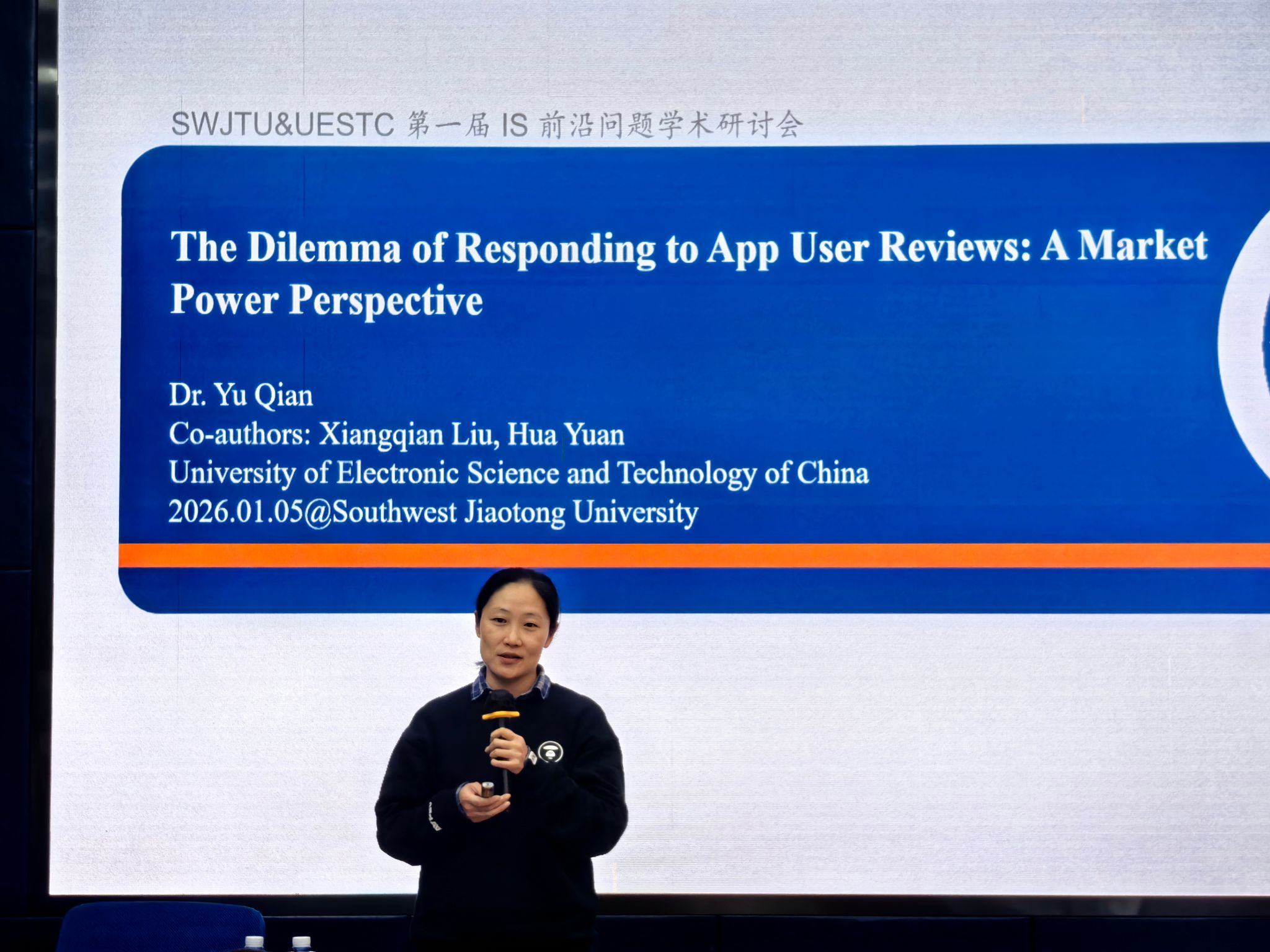 随后,计算机与人工智能学院叶晓庆副研究员简要介绍了钱宇教授的学术背景。钱宇教授的报告题目是:The Dilemma of Responding to App User Reviews: A Market Power Perspective,深入探讨了移动应用(App)在面对用户评论时的“回复困境”。她指出,虽有助于改善客户关系管理(CRM)并降低服务成本,但也可能因暴露产品迭代细节而丧失战略优势,具有显著的双刃剑效应。报告揭示市场份额对回复行为呈负向影响,竞争强度起正向调节作用,并提出高市场份额App采用模糊化更新日志、加强知识产权保护等实践启示。