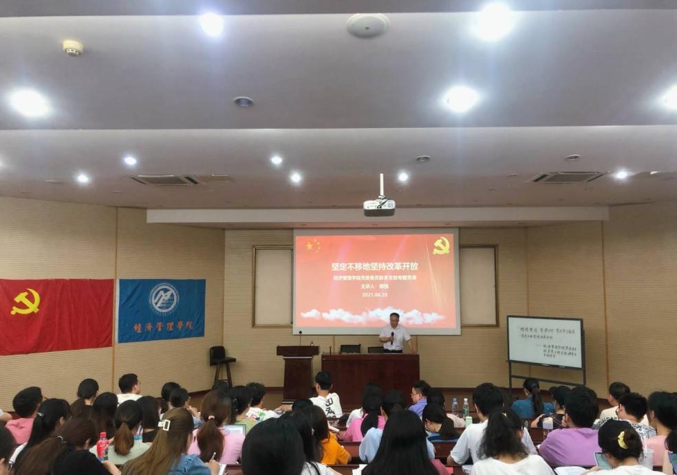 执行院长郭强同志以“坚定不移地坚持改革开放”为主题,讲授了庆祝建党百年专题微党课。参加本次党课的有学院本科经贸类党支部成员、2018级博士党支部和工程管理系教工支部成员。