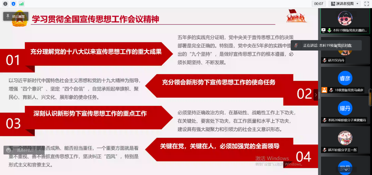 硕士2020级第二党支部与本科管理类党支部在线上举办以宣传思想工作专题和十九届六中全会学习为内容的专题学习活动。本次活动以深入推进日常政治学习为主要目的,辅以促进党支部之间的交流学习。会议由17吃瓜