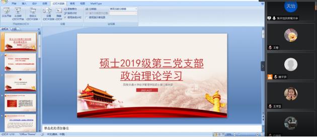 硕士2019级第三党支部于腾讯会议进行了主题为“党在社会主义革命和建设时期(1949-1978)的历史”的理论学习。学习内容主要分成两个部分,第一部分为“党在社会主义革命和建设时期(1949-1978)的历史”,第二部分为“习近平在清华大学考察时的重要讲话精神”。支部全体成员参与会议,学习由张天怡、谢洁同志主持。