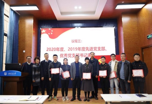 在2019及2020年度先进党支部和优秀党支部书记表彰环节,学院党委副书记江宇兰同志宣读了表彰名单,到会的学院党委委员为受到表彰的先进党支部和优秀党支部书记颁发了荣誉证书。