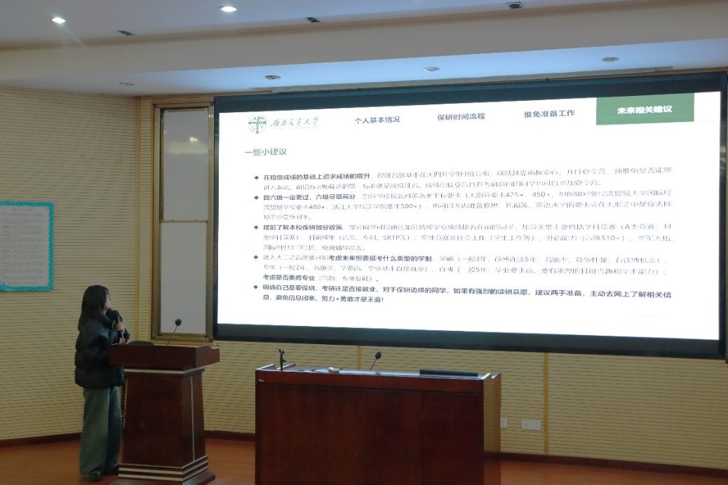 韩志成同志以“掌握信息,快人一步”为核心,结合自身实际情况,详细展示了自己在保研过程如何高效获取有价值的信息。他强调了信息获取与分析的重要性,注重细节,收集信息,巧用方法,用更便捷高效的方式达成目标也是一种“保研智慧”。同时,他也向低年级支部成员提出建议,要不断提高英语和数理水平,为未来研途奠定坚实基础。