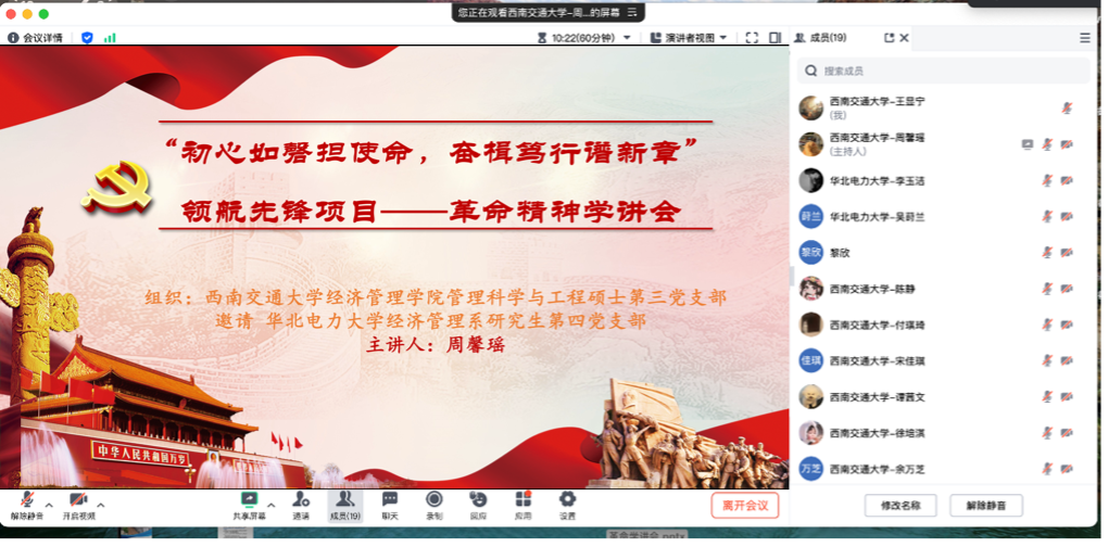 两支部在参观结束后,于99日上午10时开展线上革命学讲会宣讲。通过视频会议的方式,大家分享了自己的参观经历和心得体会,进一步加深了对革命历史的认识和理解。党支部成员们纷纷表示,通过此次活动,不仅增强了党性修养和爱国主义精神,也加深了两校党支部之间的友谊和合作。