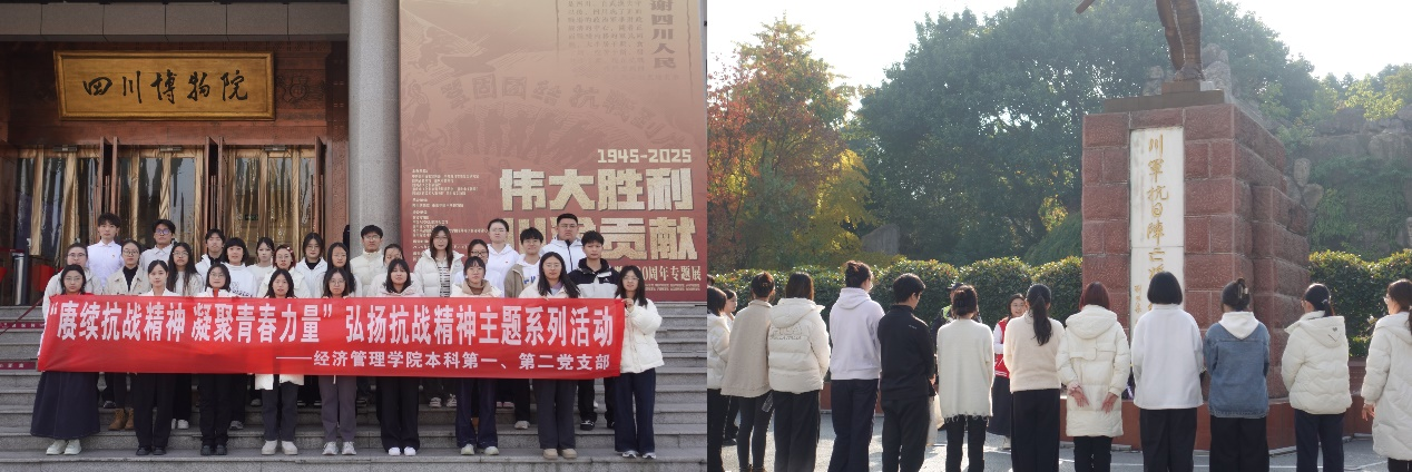 为进一步深化爱国主义教育,传承和弘扬伟大抗战精神,强化青年党员的历史认同与使命担当。11月27日,支部前往四川博物院与成都人民公园开展实地研学。在四川博物院《伟大胜利 川渝贡献》展厅,通过历史实物与文献,深切体会川渝人民的抗战贡献。随后,在人民公园川军抗日阵亡将士纪念碑前,聆听川军将士“单衣草鞋出川抗日”的感人故事,感受其崇高的爱国气节。最后,全体成员围绕“抗战精神的当代价值与青年担当”展开现场研讨。本次研学通过“实地参观+现场教学+主题研讨”的形式,生动体现了红色教育的铸魂作用,强化了党员的历史认同与责任意识。