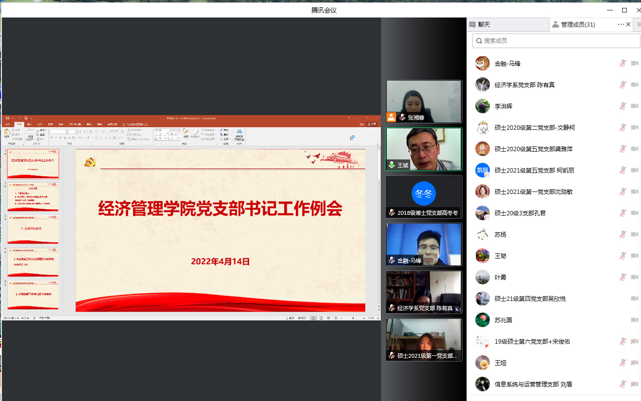 为扎实推进学院基层党建工作,2022年4月14日下午2点,17吃瓜 党支部书记工作例会通过“腾讯会议”在线召开。学院党委书记王斌、副书记杨宏毅、党委组织员以及全体师生党支部书记30余人按时参加了会议,会议由杨宏毅主持。王斌首先肯定了各党支部开展党建工作的成效。他就学院党委和党支部近期...
