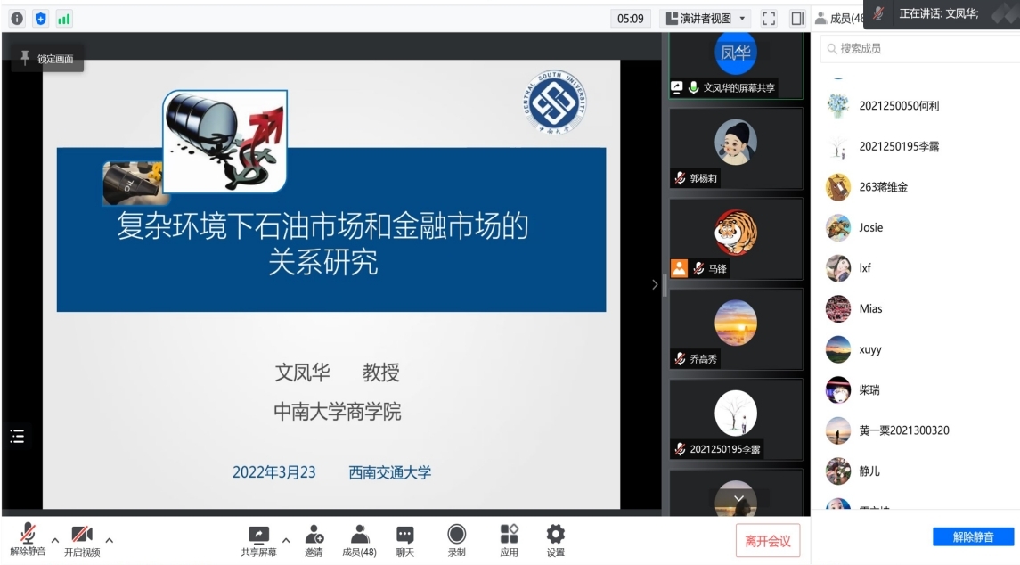 3月23日上午10点中南大学商学院文凤华教授学术讲座在线上举行,文凤华教授以“复杂环境下的石油市场和金融市场关系研究”为主题进行了精彩的分享。本次学术活动由学院金融学系马锋副教授主持,朱宏泉教授、梁超老师以及研究生参加了本次讲座。文凤华教授首先介绍了文章的研究背景,对石油价格与美元...