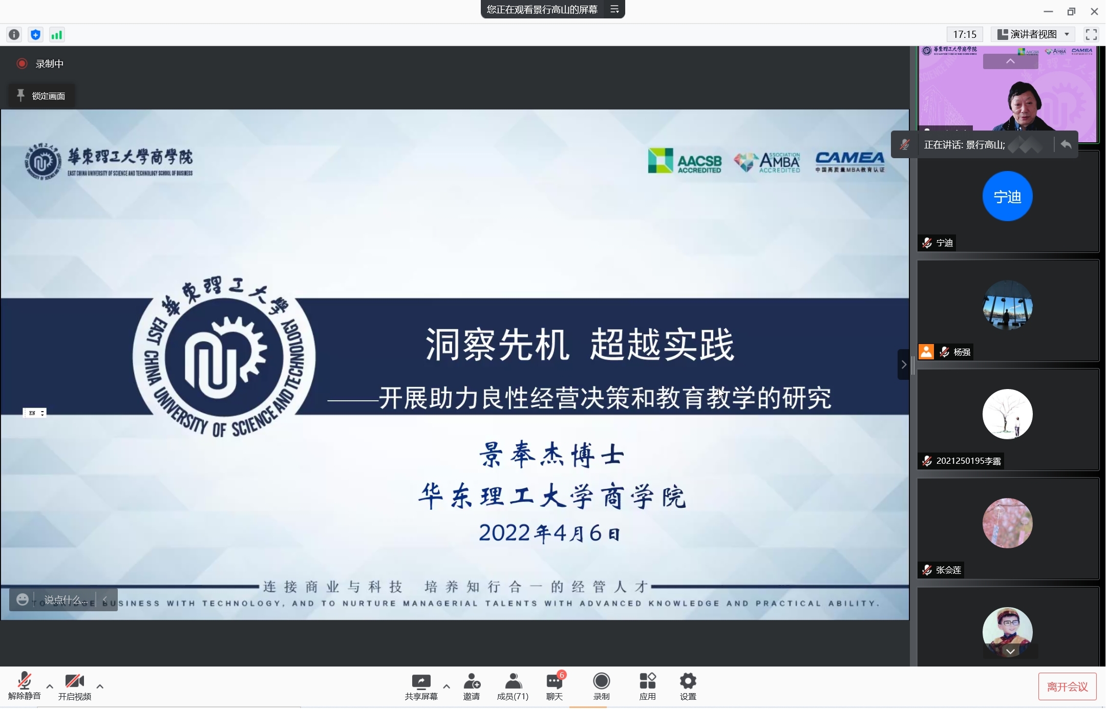 4月6日上午9:30,华东理工大学商学院景奉杰教授学术讲座在线上举行,景奉杰教授以“洞察先机,超越实践,开展助力良性经营决策和教育教学的研究”为主题进行了精彩的分享。本次学术活动由学院市场学系蒋玉石教授主持,学院执行院长郭强教授以及学院部分教师、九十余名研究生在线参加了本次讲座。...