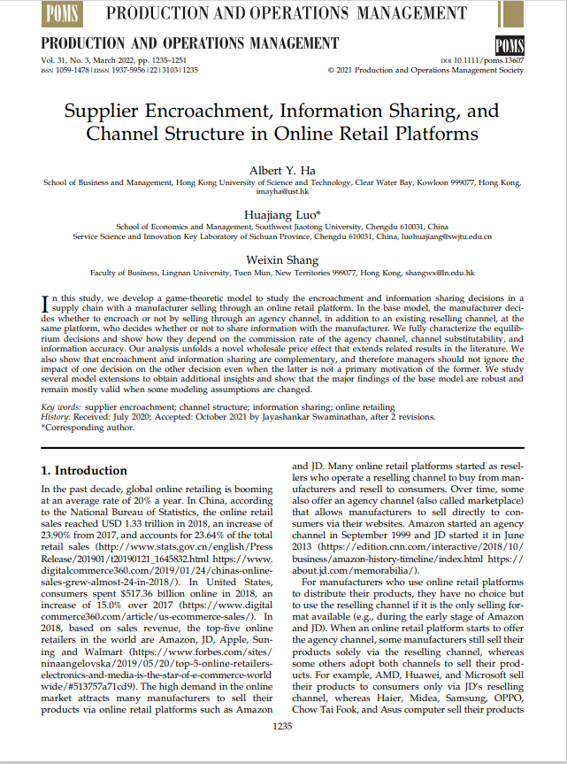 17吃瓜 罗华江老师于2022年3月在UTD 24期刊Production and Operations Management在线公开发表题为Supplier Encroachment, Information Sharing, and Channel Structure in Online Retail Platforms的论文。该论文考虑由一个制造商和一个网络零售平台组成的供应链中,制造商的渠...
